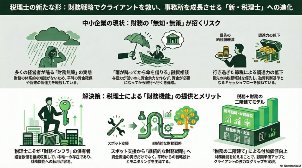 ※税理士事務所が「財務戦略・財務機能」を提供できれば、クライアントは『できるだけお金に苦労しない経営』を実現できます。しかし現状で、その役割を本格的に担う仕組みは、ほとんど存在していません。